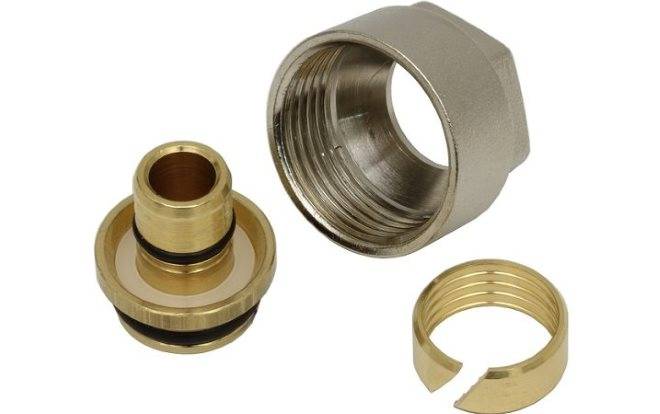 - Цанговые можно собирать и разбирать, встречаются разборные резьбовые фитинги. Корпус латунный, крепление на трубе на прокладку с обжимным кольцом. Чтобы собрать фитинг, на откалиброванный конец трубы накрутить гайку, надеть кольцо и до упора натянуть фитинг. Потом снова кольцо и гайка – ее сначала подкрутить пальцами, а потом притянуть ключом. Срок службы разборных фитингов до 3-х лет, потом они дают течь. Можно подтянуть гайку, но лучше заменить элемент на новый.