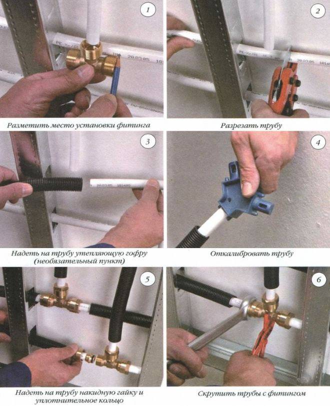 Итак, металлопластиковых труб монтаж с использованием обжимных фитингов выполняется в следующей последовательности: