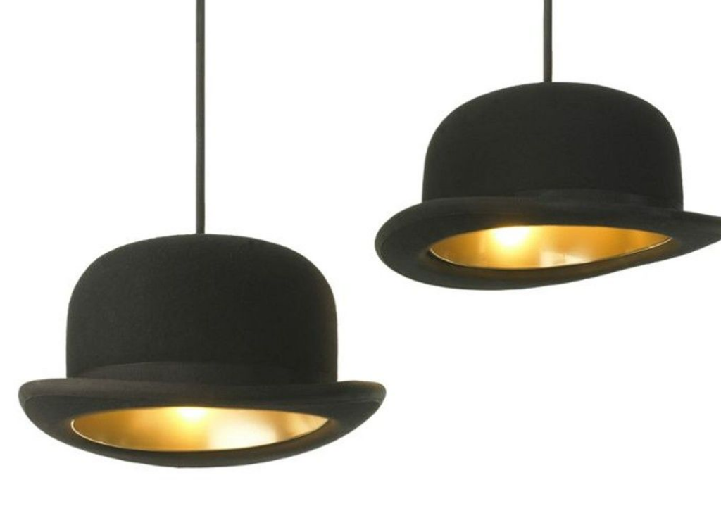 Если в шкафу остался мужской котелок (шляпа), он пригодится для стильного светильника. Останется купить шнур, лампочку, патрон, сделать отверстие в шляпе и необычный светильник готов. Абажур для светильника изготавливают также из стеклянных баночек, бутылок, веток, пластиковых ложек, веревок и даже велосипедного колеса.