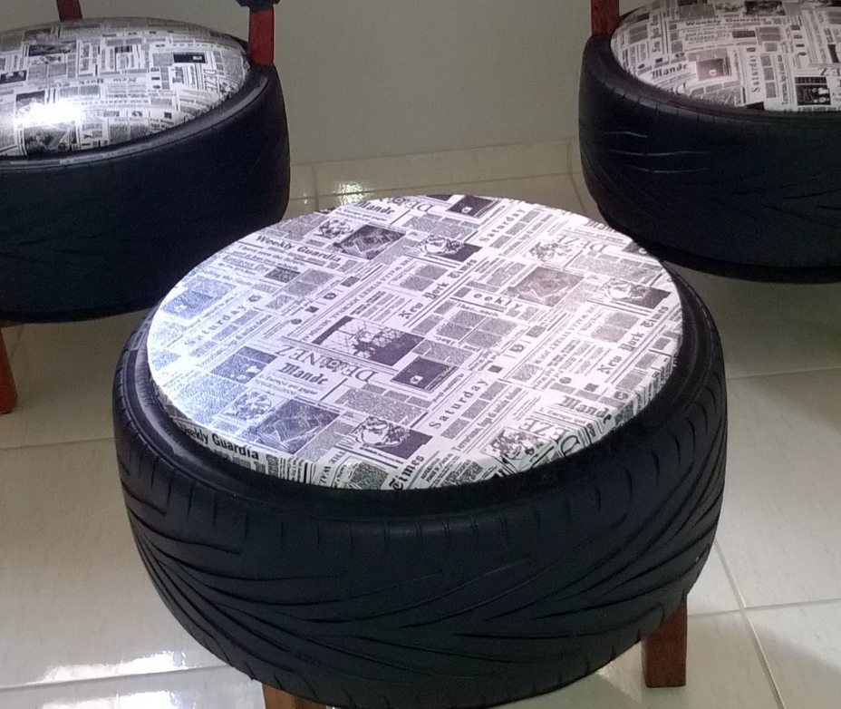 - Из старых автомобильных шин делают пуфик или кресло. К покрышке с двух сторон крепят круги из фанеры, вырезанные по диаметру шины. Прокладывают поролоном, синтепоном, дюрафилом, обтягивают тканью, кожзамом, шьют чехол. Из шин также получается журнальный столик.