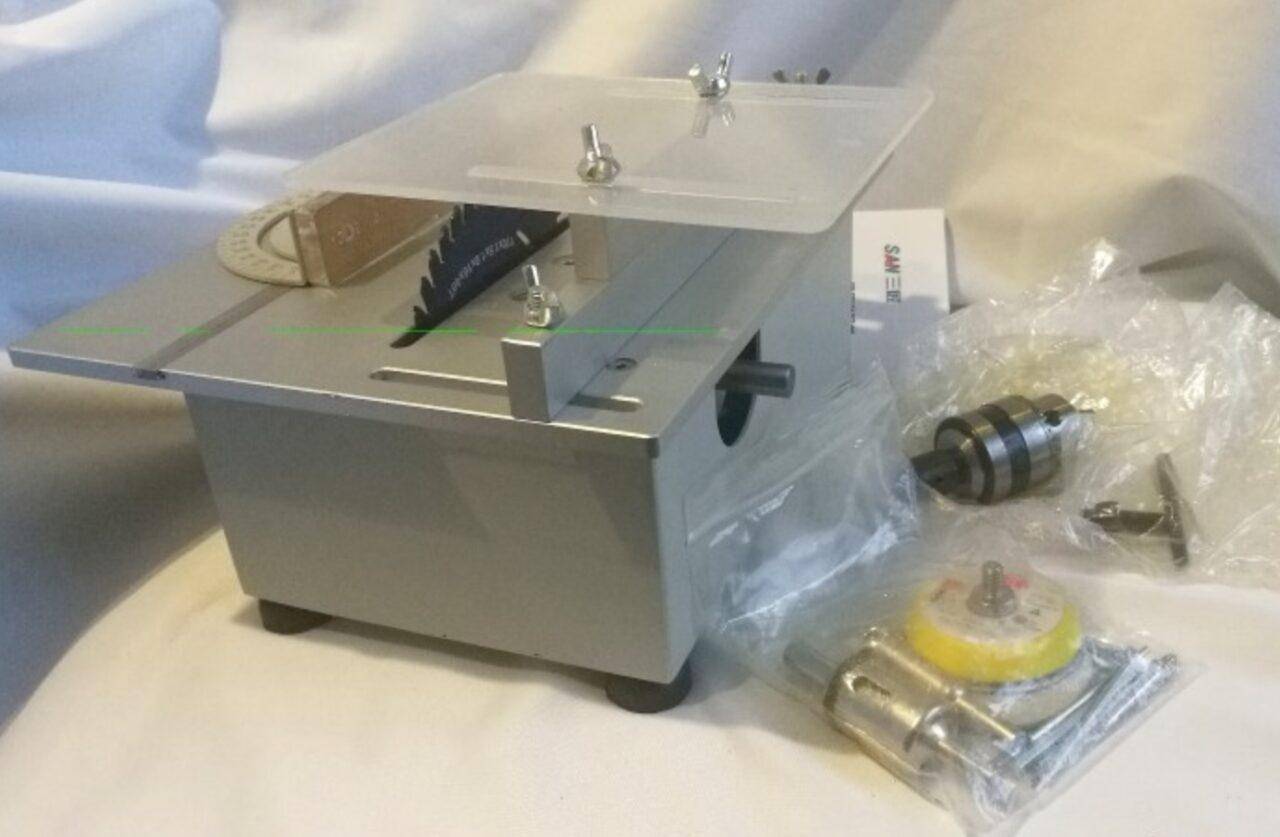 В комплект входят сама настольная циркулярная пила, диск диаметром 110 мм, патрон сверлильный В12, шлифовальный диск и 3 наждачки к нему. На мой взгляд, весьма полезный инструмент, который можно разместить у себя на даче.