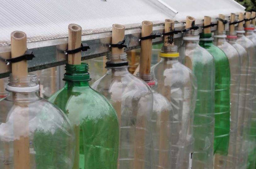 За день солнце нагревает грунт и внутреннее пространство парника. Вечером нагревшаяся в бутылках вода отдает тепло корням растений, сглаживая суточные температурные перепады.