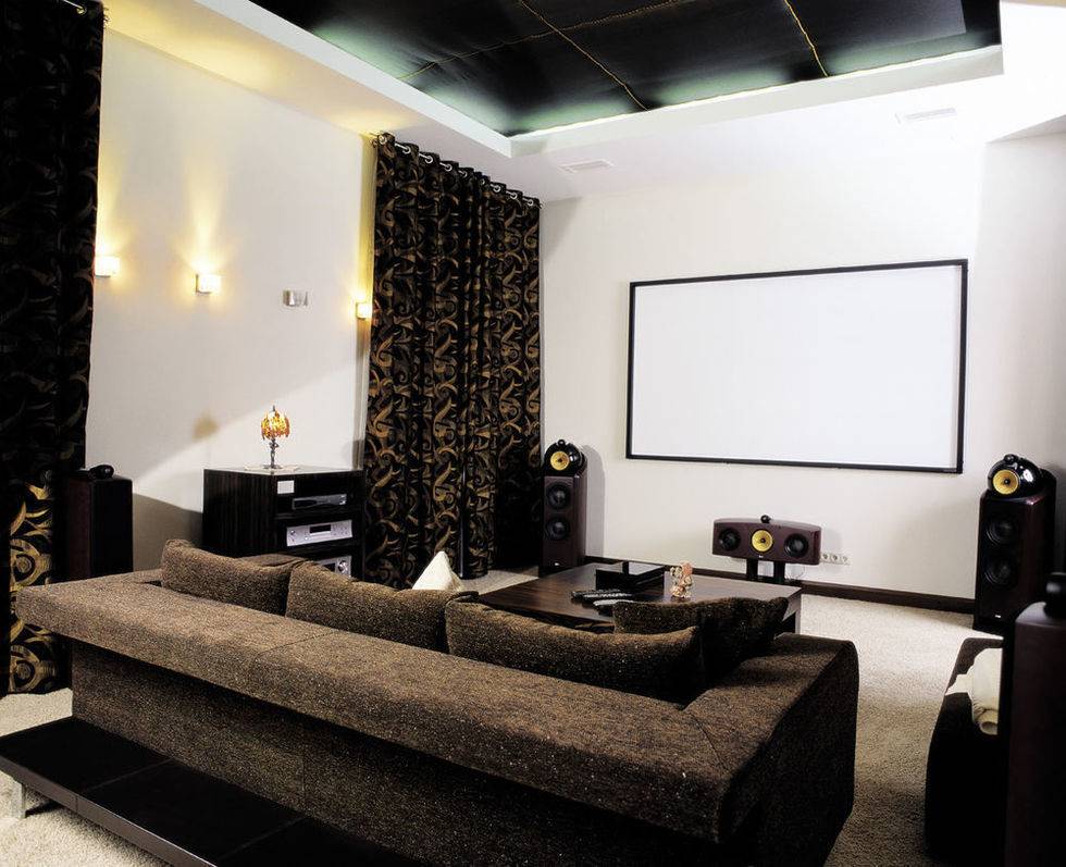 Можно установить домашний кинотеатр в гостиной или спальне, например. Но наиболее подходящим вариантом будет отдельная комната, если есть такая возможность, где все будет оборудовано и направлено специально на просмотр видео. Архитекторы и дизайнеры советуют подбирать форму комнаты прямоугольную, вытянутую. Количество окон должно быть минимальным. Естественно, вам понадобятся плотные шторы, портьеры, чтобы дневной свет не искажал изображение на экране.