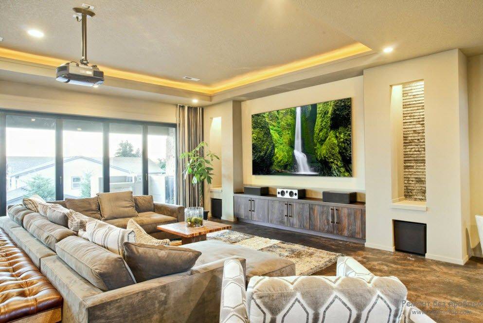 В современном дизайне интерьера домашний кинотеатр со всей его аппаратурой прекрасно вписывается в общую концепцию, особенно если это стиль хай-тек или минимализм.
