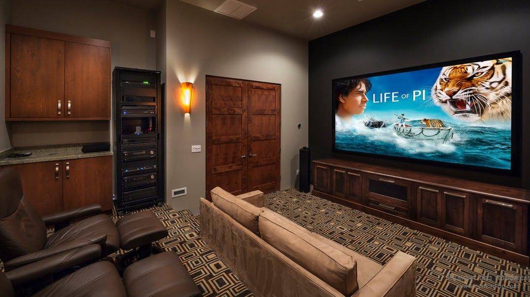 Но дело в том, что пастельные оттенки очень сильно отвлекают от просмотра фильмов. Для того, чтобы вы смогли полностью погрузиться в вымышленный мир кино, вам нужно использовать темные насыщенные тона. Перед тем, как принять решение о цвете, используемом для отделки, посмотрите на него не при дневном или ярком искусственном освещении, а в полумраке. Не забывайте, что во время просмотра фильма помещение освещается исключительно экраном, соответственно изменяется восприятие цветов.
