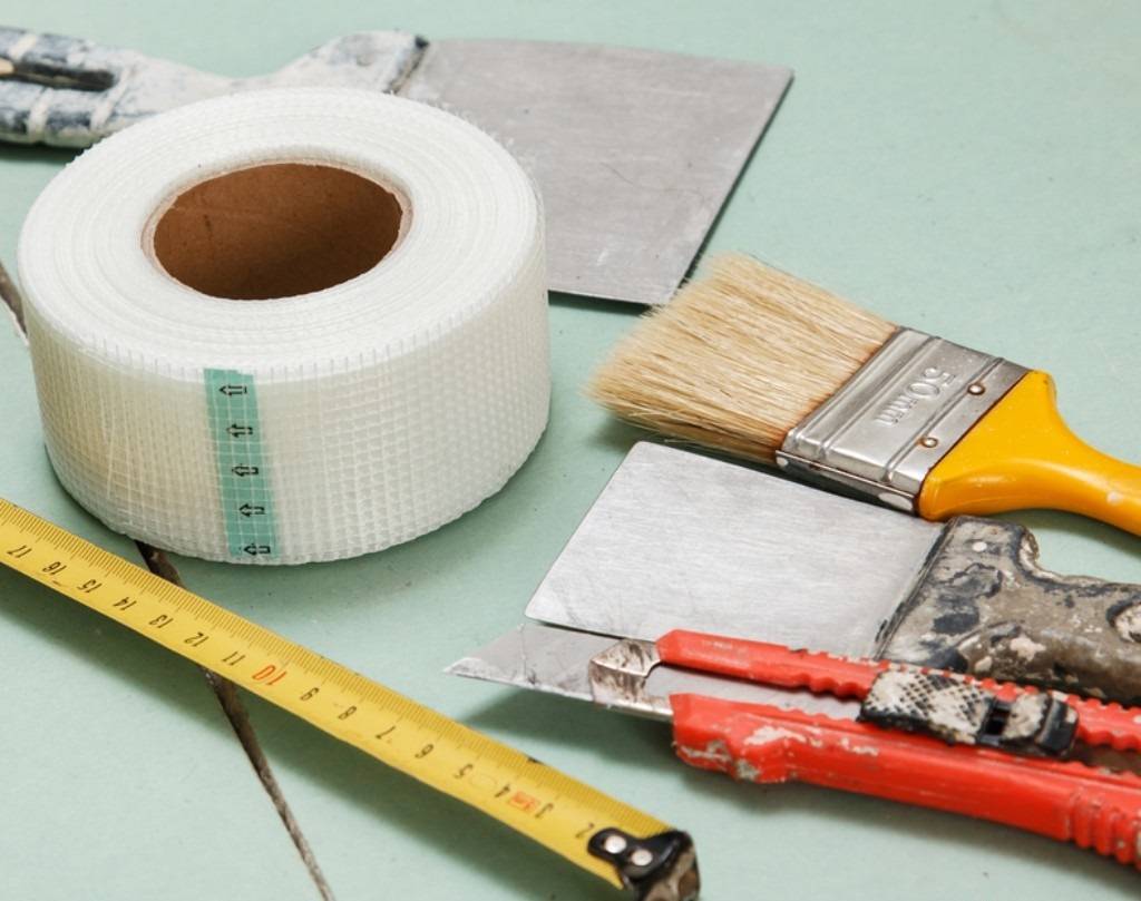 Из материалов нужна грунтовка, шпатлевка для заделывания швов, специальная лента-серпянка, шпатлевка финиш, планки перфорированные для обработки углов, шлифовальные сетки. При необходимости приобретают респиратор или изготавливают повязку самостоятельно.