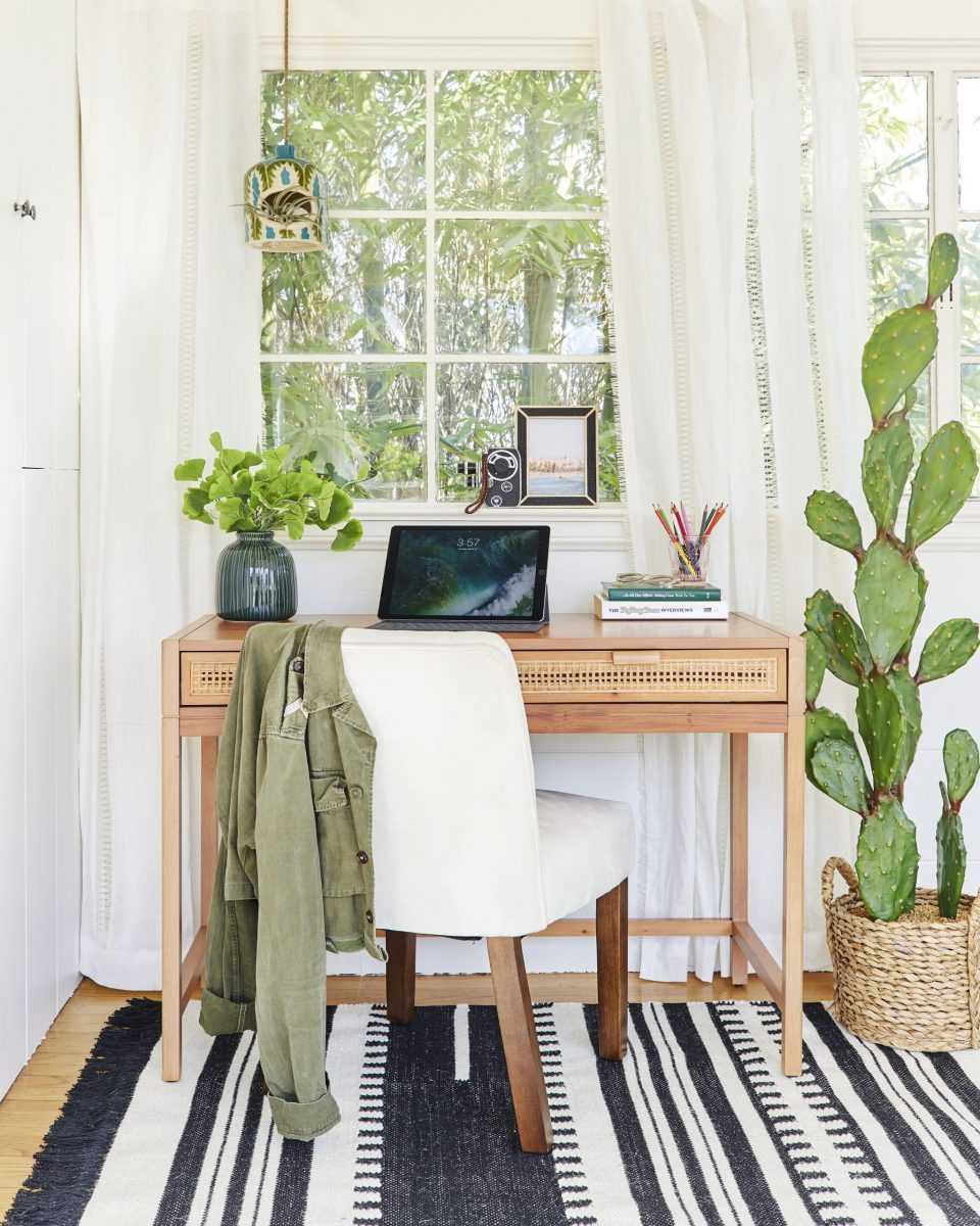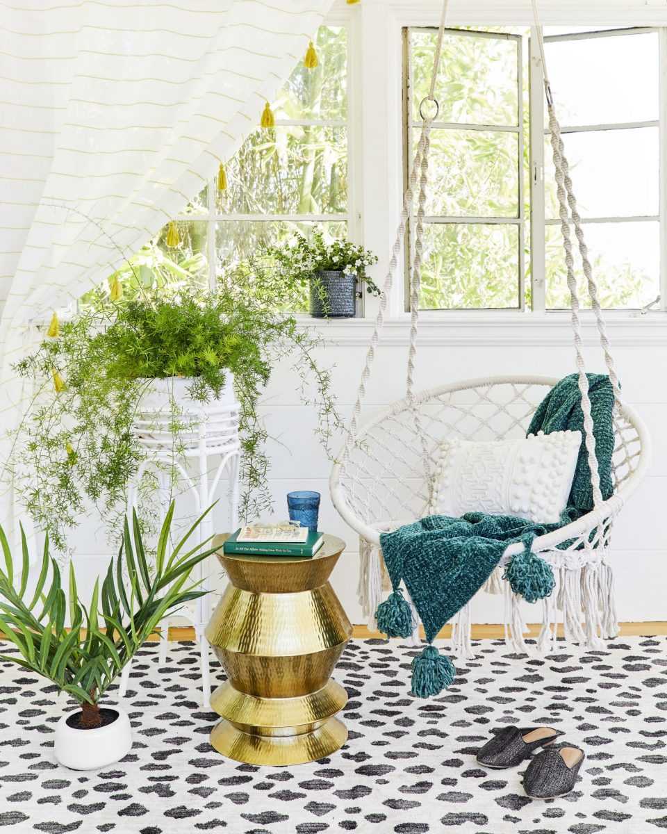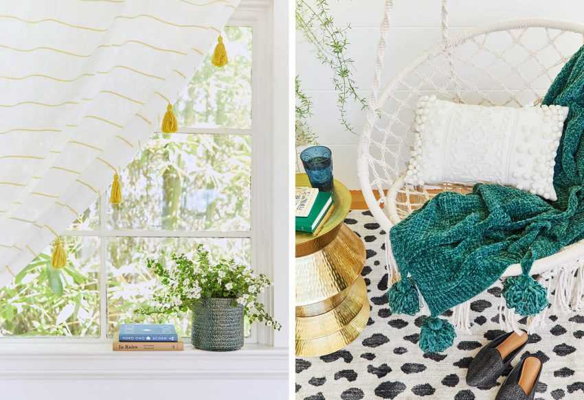 | Эко | Наиболее подходящая основа интерьера — обои с изображением множества растений на белом фоне. В таком случае декор излишен, достаточно дополнить комнату пледами, подушками с принтами и ковром. |