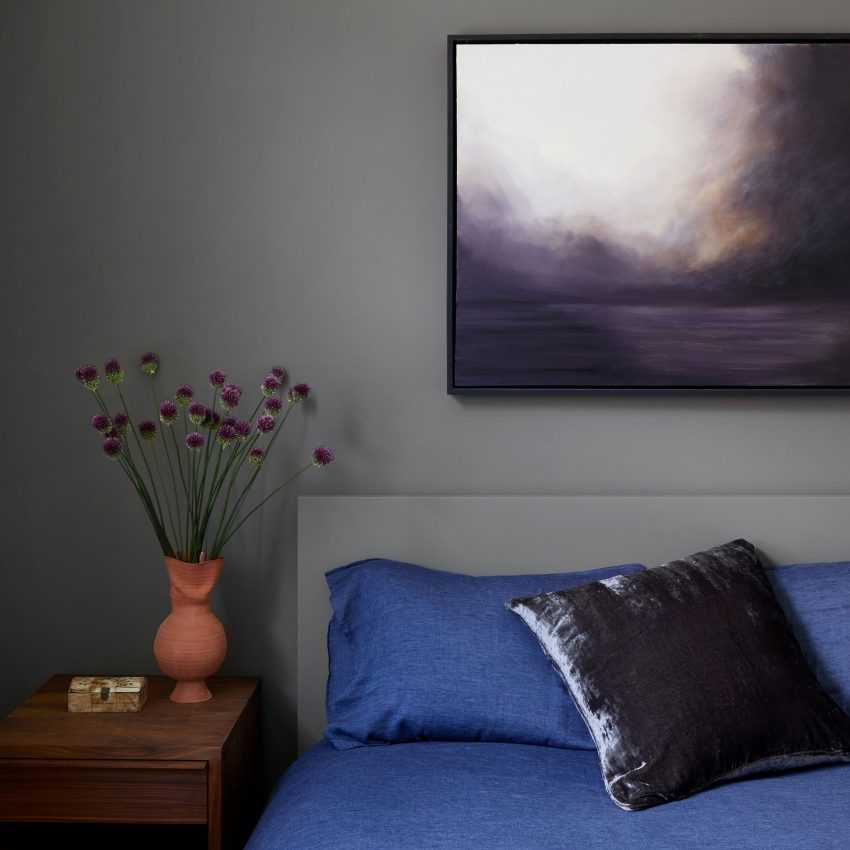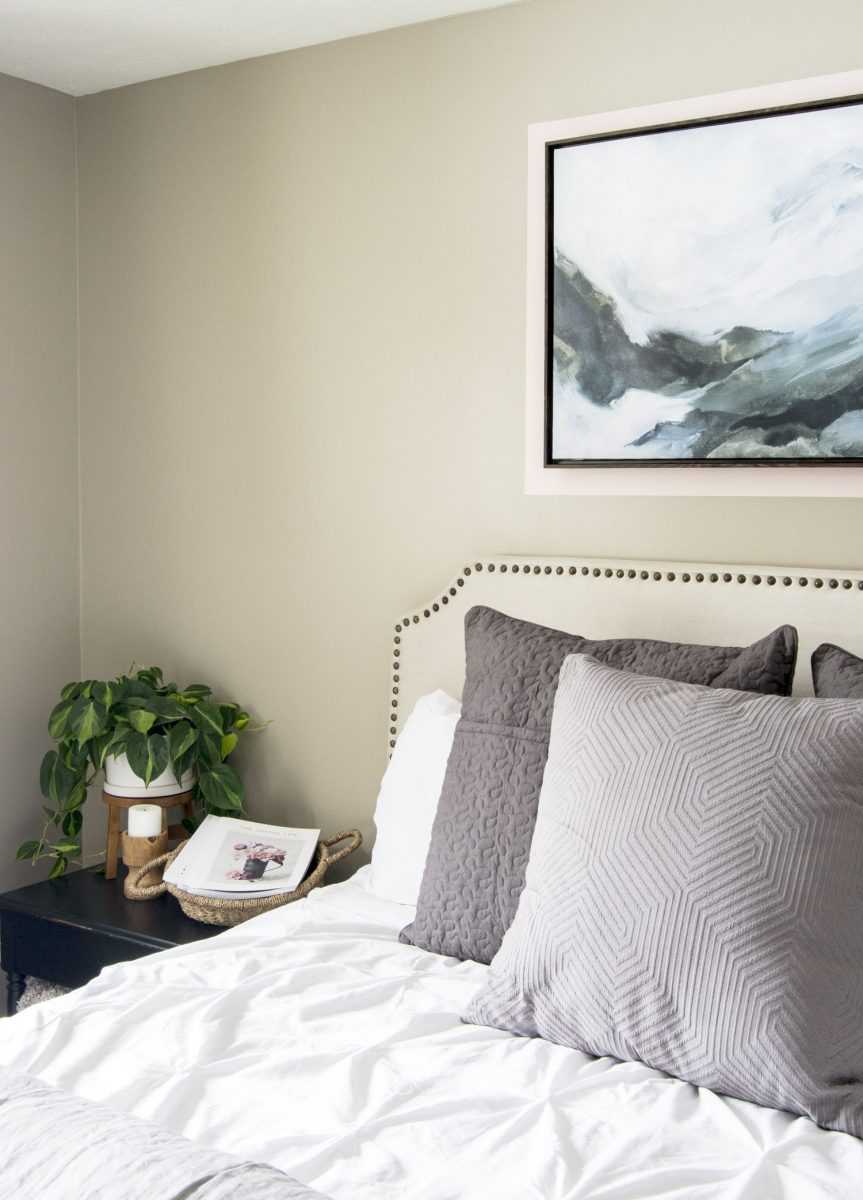 Стену над изголовьем кровати можно украсить композицией из фотографий в стильных рамках или картиной.