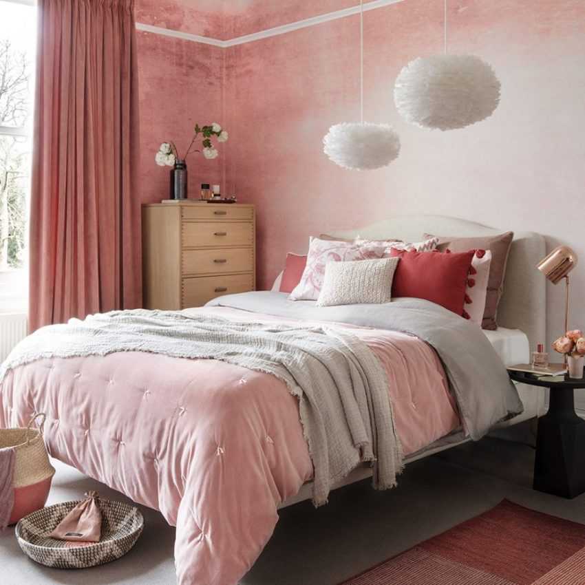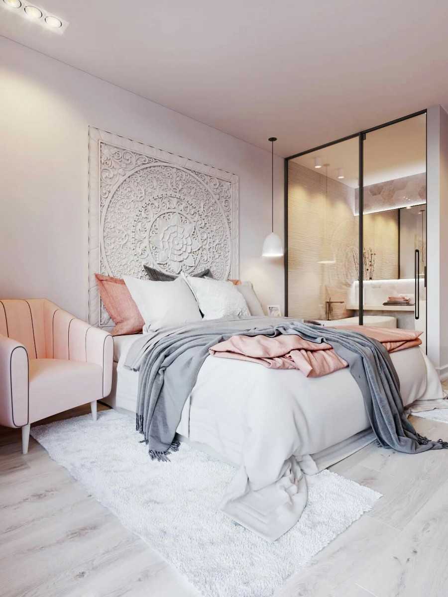 Для современных спален сегодня лучшим считается розовый цвет очень светлого оттенка. Он может быть сиреневатым, кремовым или слегка дымчатым.