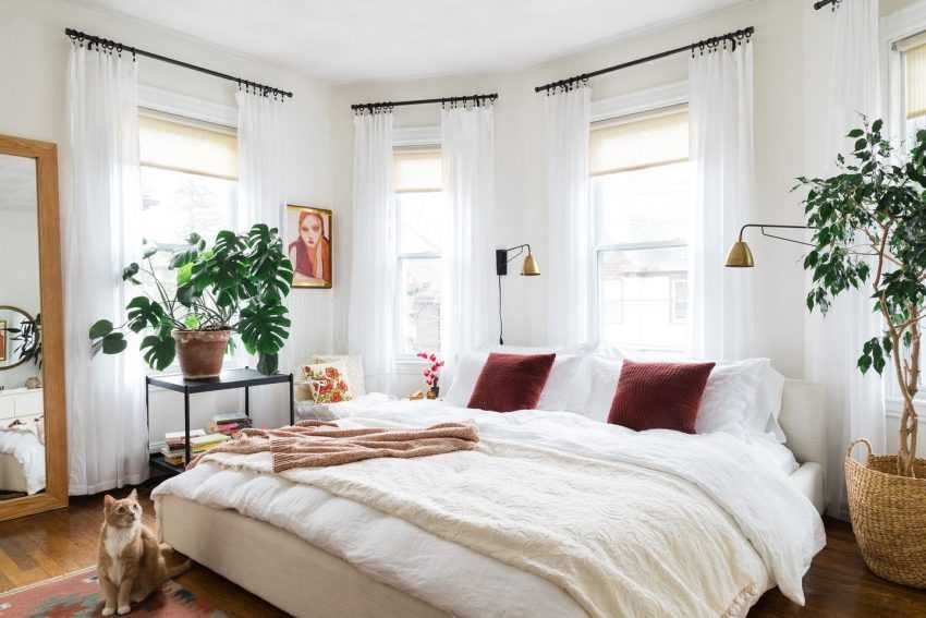 В месте кровати должен быть ковер, а если пространство на полу не позволяет, то маленький коврик. Если речь идет уже о комфорте, будет крайне полезно использовать халаты или мягкие тапочки, не говоря уже об удобной пижаме. В уютной спальне интим зависит от занавесок. В их компании интерьер сразу станет теплее и нежнее.
