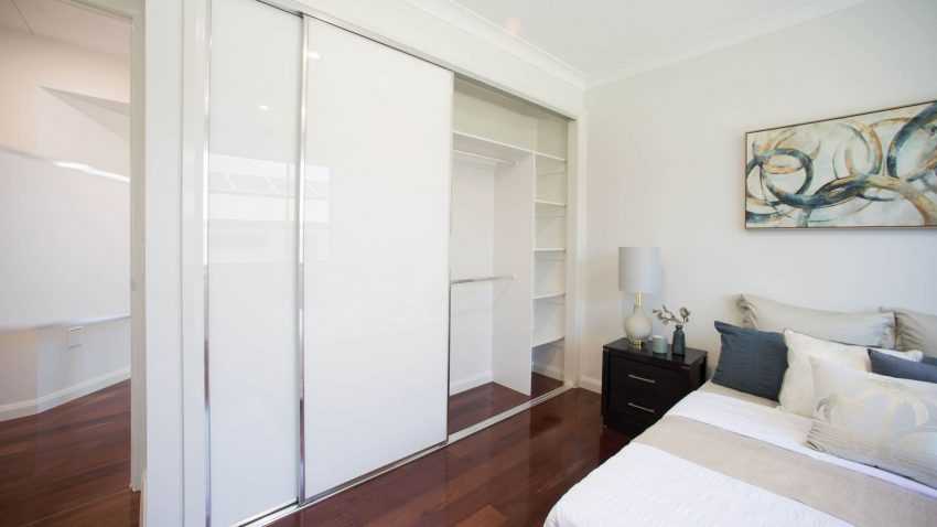 Отличным решением для маленького помещения станет мебельный гарнитур с комбинированным фасадом двух цветов. К такой мебели будет проще подобрать сочетание цвета стен и текстиля, она визуально увеличит спальню и станет самостоятельным акцентом в комнате.