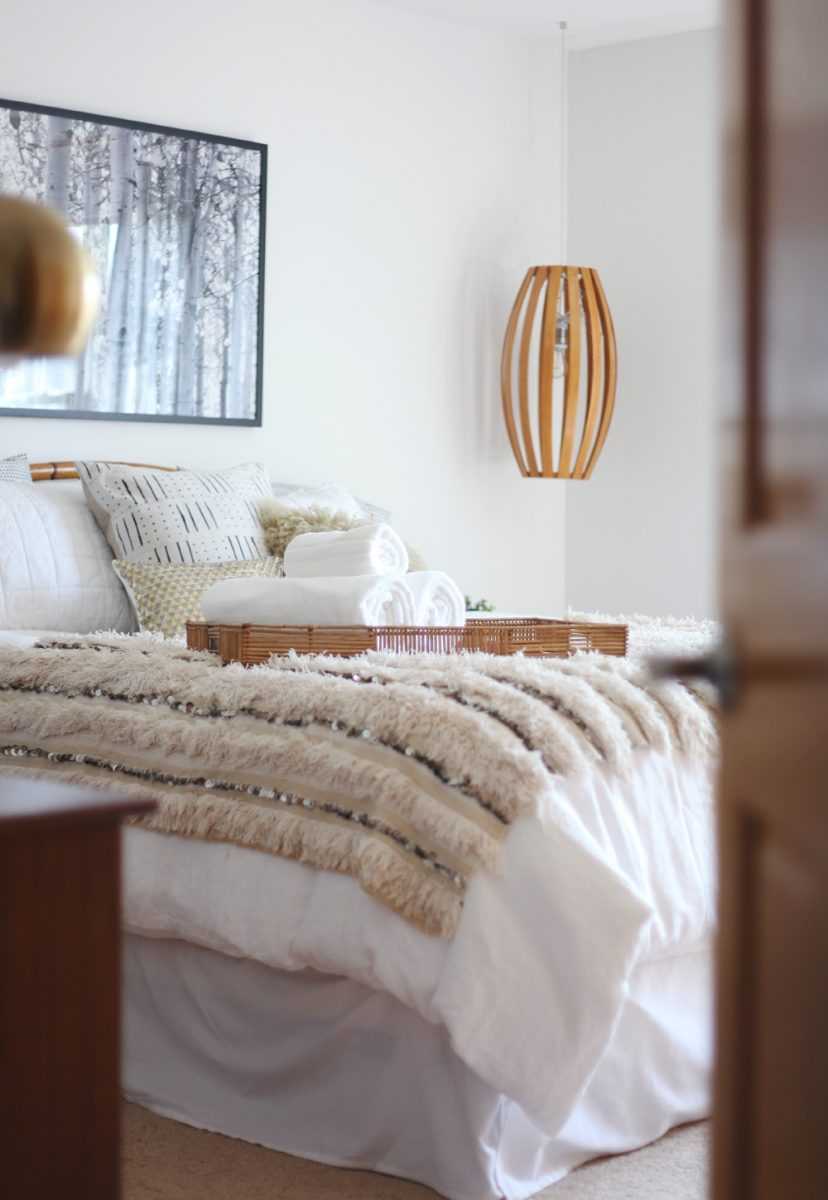 При оформлении спальни в скандинавском стиле советуем обратиться к натуральным оттенкам и материалам. Для отделки и текстиля прекрасно подойдет белый, песочный, серый, темно-синий, коричневый и темно-зеленый. Из материалов можно использовать древесину, камень, керамику, натуральный или искусственный мех.