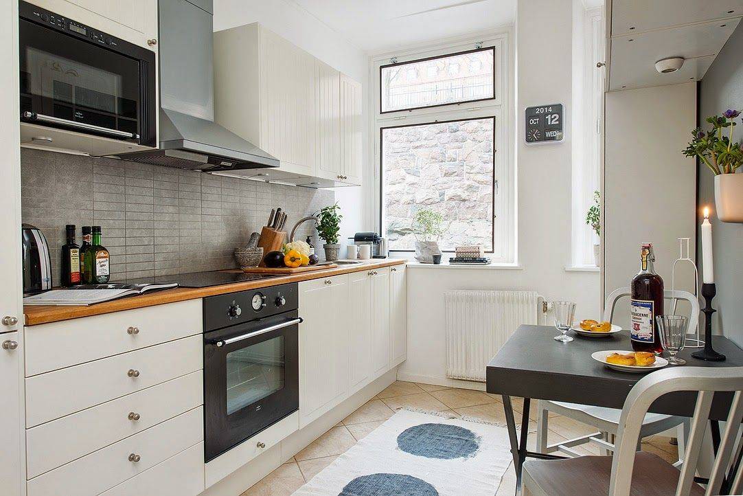 Если узкая кухня еще и маленькая (всего 4−6 кв. м), то вариантов для дизайна немного. Нужно по максимуму задействовать все имеющееся пространство: