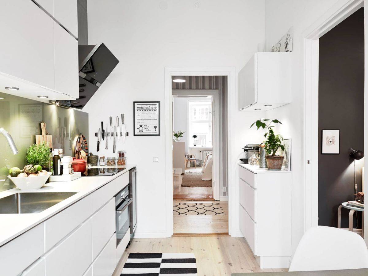 Со вкусом подобранный гарнитур, свет и аксессуары сделают даже самую неудобную узкую кухню уютной и шикарной.