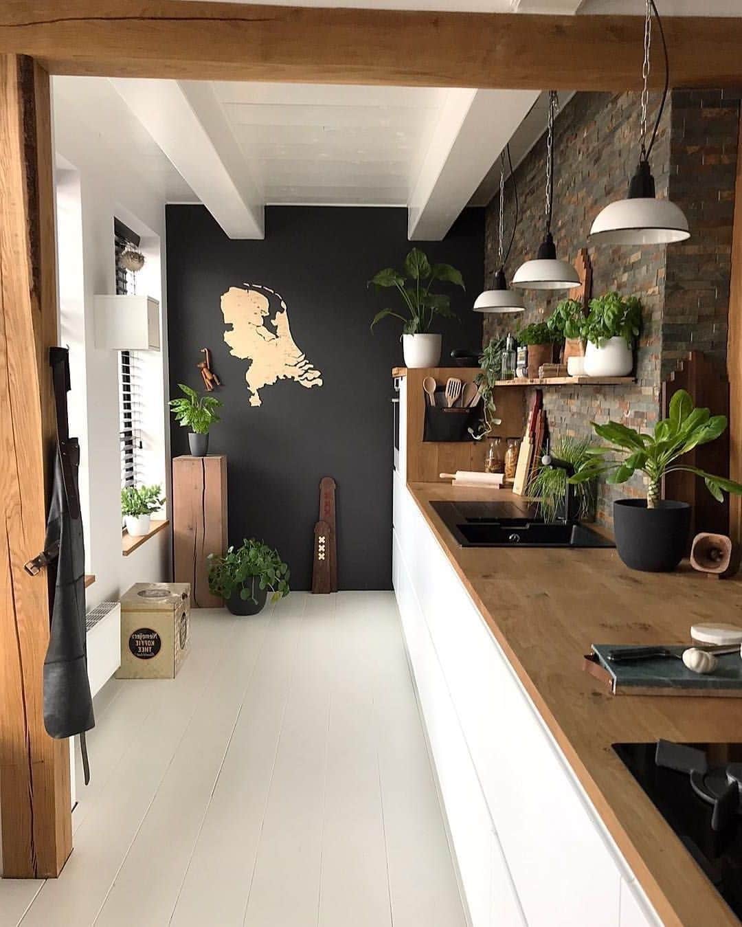 Иногда в частных домах используют следующий прием. Все пространство у входа в дом отводят под кухню. Получается узкая и довольно длинная комната. Вот пример подобного дизайна.