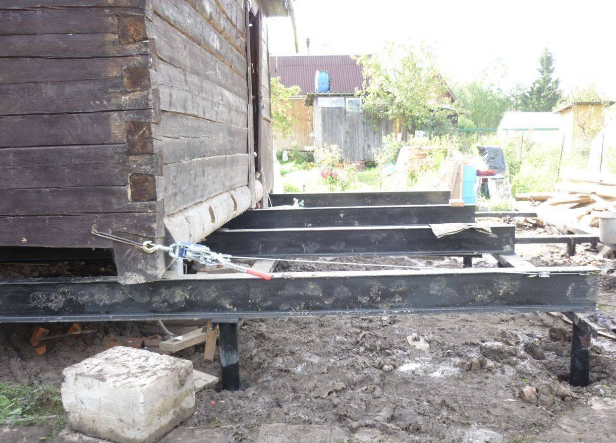 - 3) Подъем производится максимально плавно и не более, чем на 5см за раз. После каждого захода под стены подкладываются деревянные брусья.