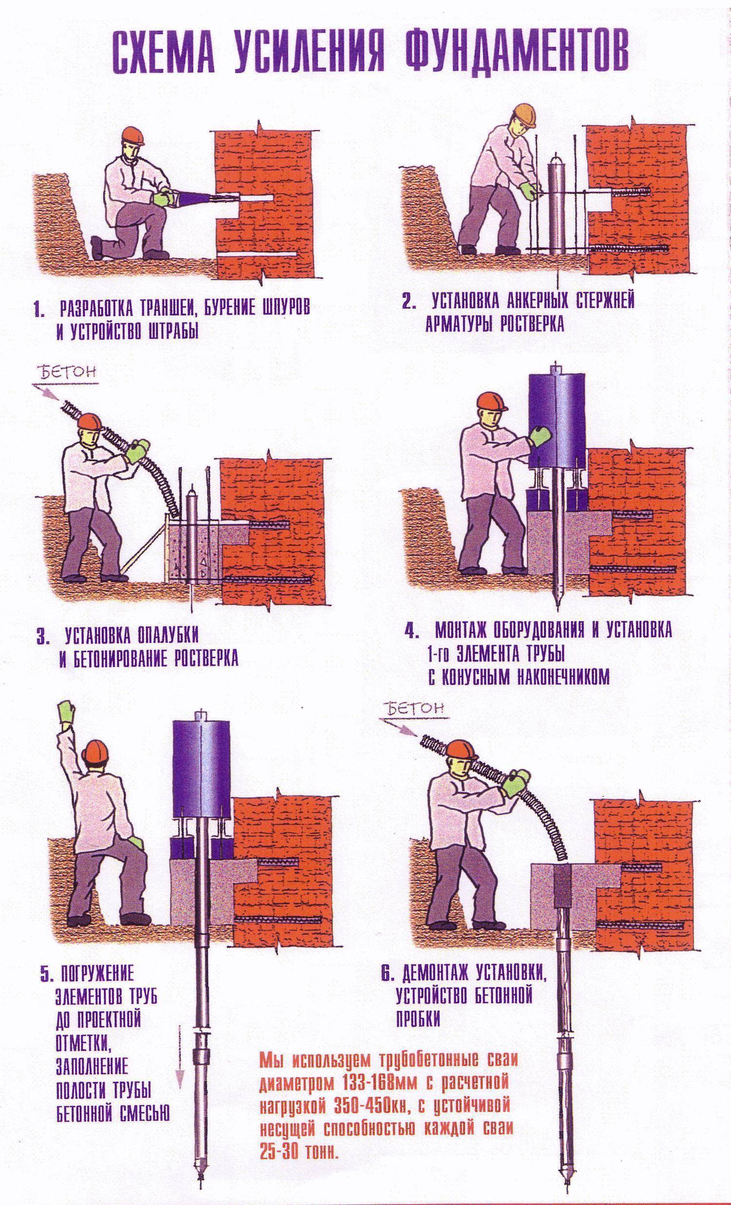- 4) Как только дом будет установлен на нужной высоте, приступают собственно к укреплению старого фундамента.