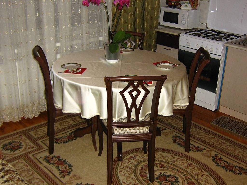 Совет! Наиболее удобным будет круглый стол, диаметр которого не превышает 1,5 метра, в противном случае всем сидящим за ним людям будет неудобно тянуться к расставленным блюдам.