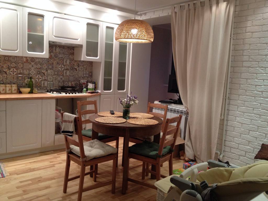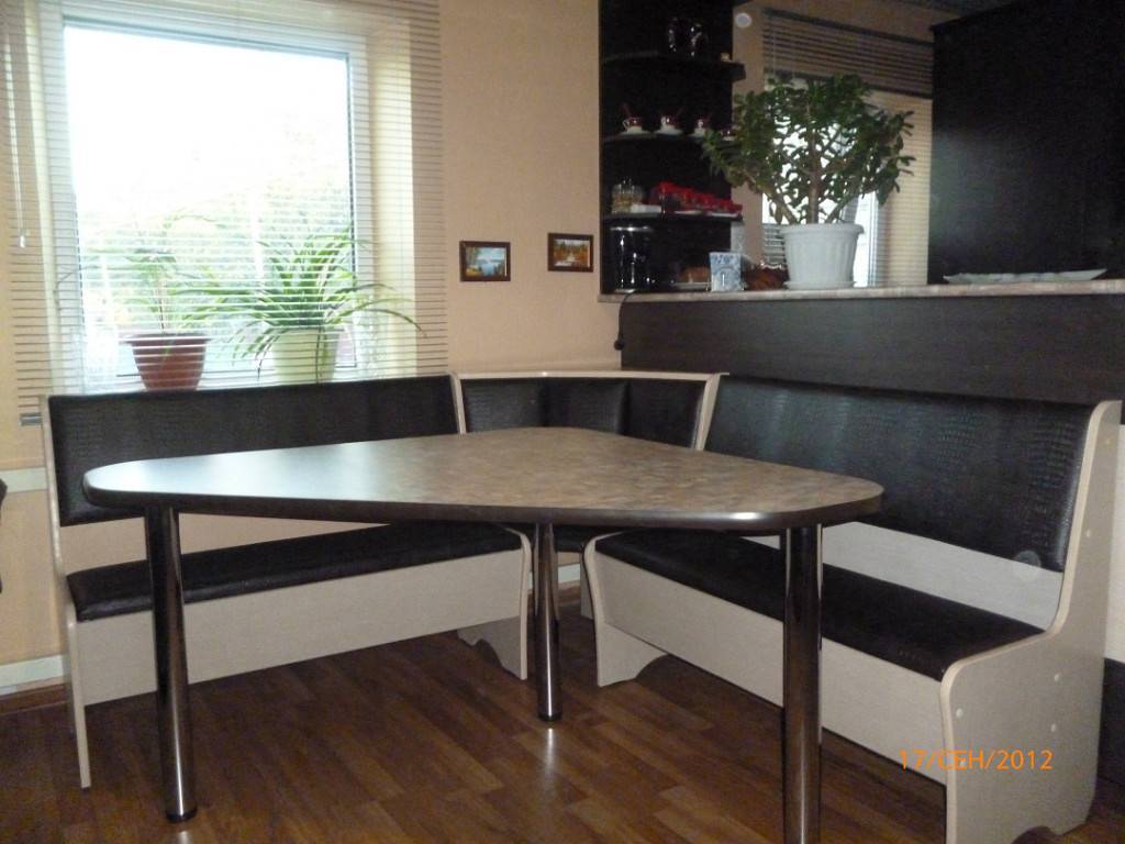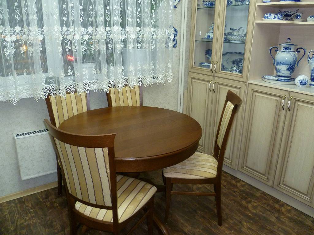 Однако такую модель следует выбирать лишь в том случае, если семья состоит всего лишь из двух человек. Преимущества такого стола заключаются в том, что его можно прикрепить к одной из стен в небольшой кухне, и обойтись при этом всего одной парой ножек (такое решение позволит сэкономить немного пространства в помещении).