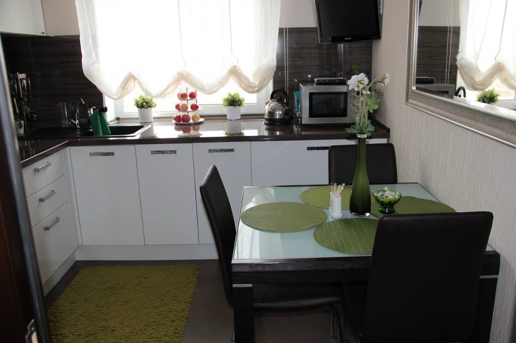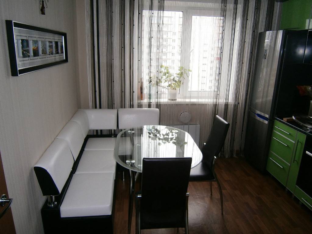 Яркие или черные стеклянные столы отлично сочетаются с кухонным белым глянцевым гарнитуром. Но при таком выборе учтите — потребуется постоянная и тщательная уборка: и белый глянец, и черное стекло не терпят малейших следов пыли, грязи. Даже отпечатки пальцев на них видны.