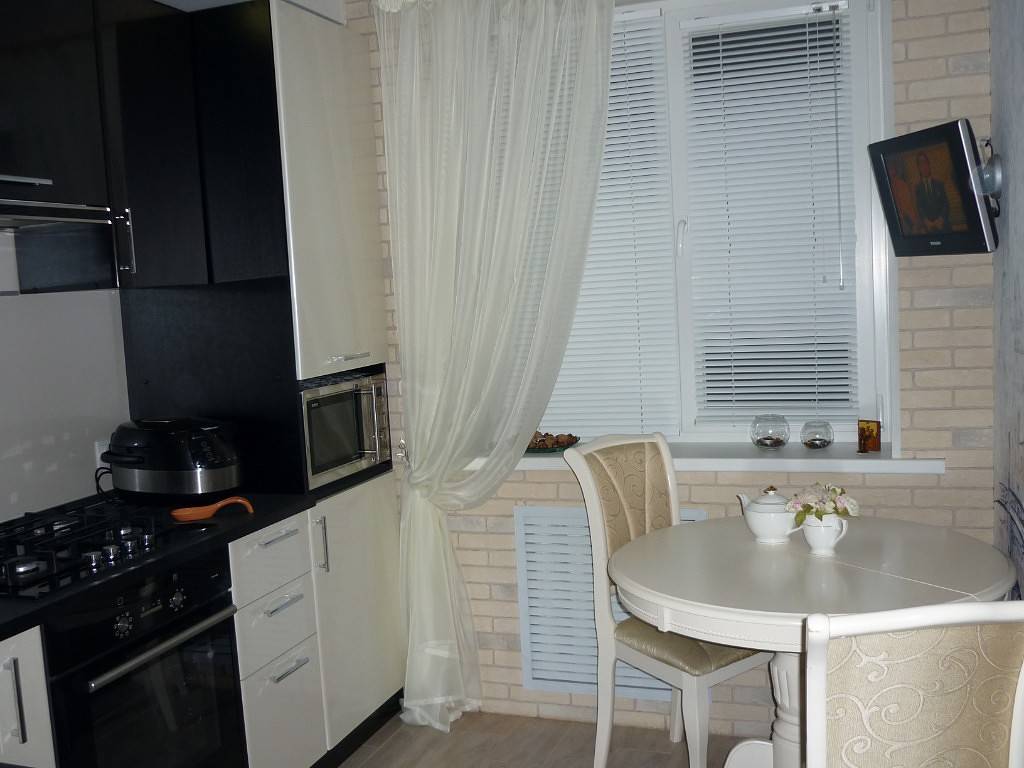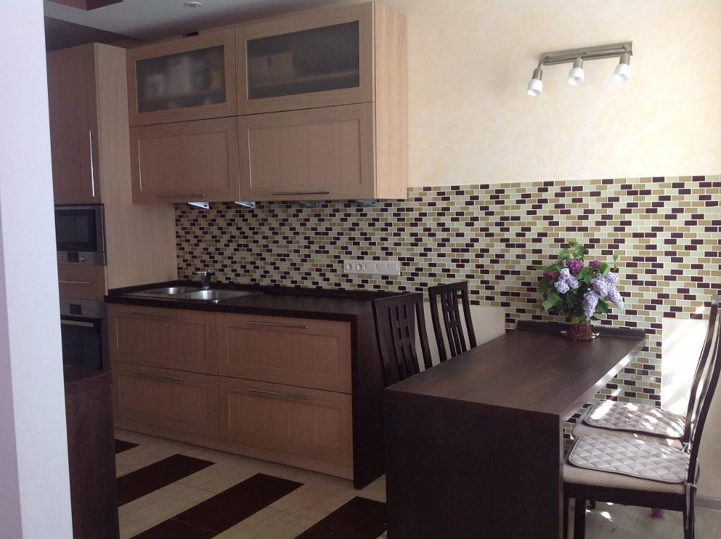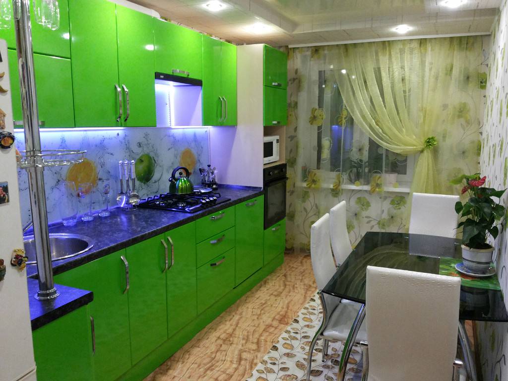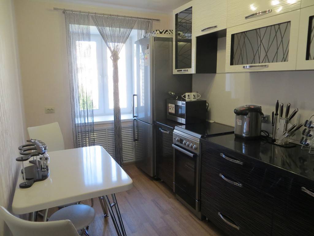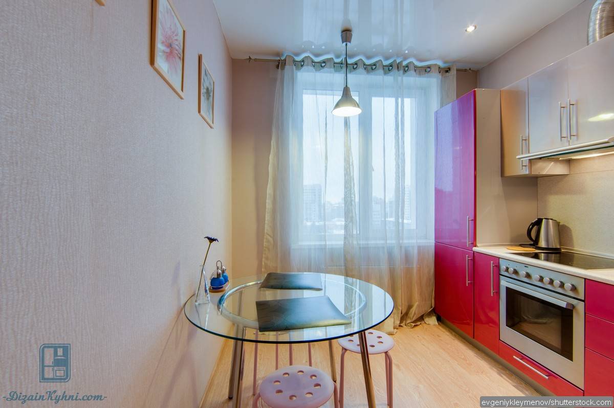 В узких кухнях прямоугольную мебель размещают рядом с окном или стеной, чтобы не загромождать комнату.