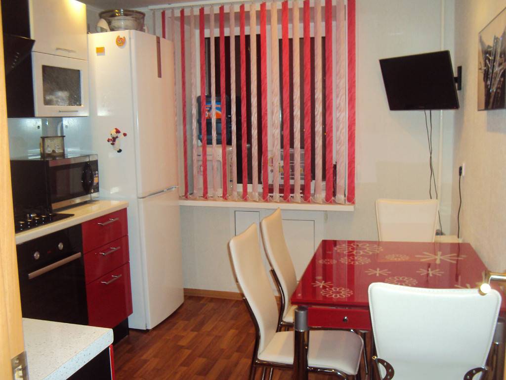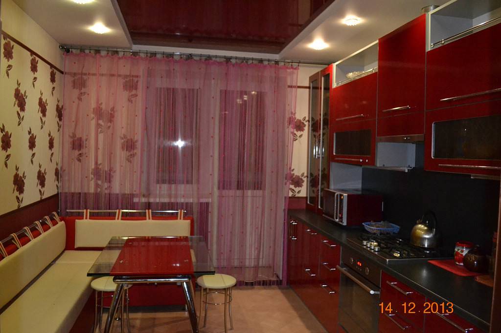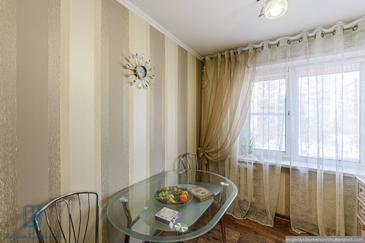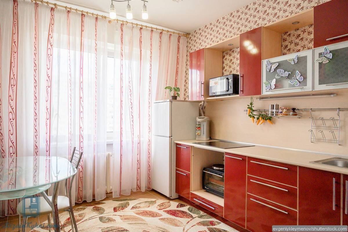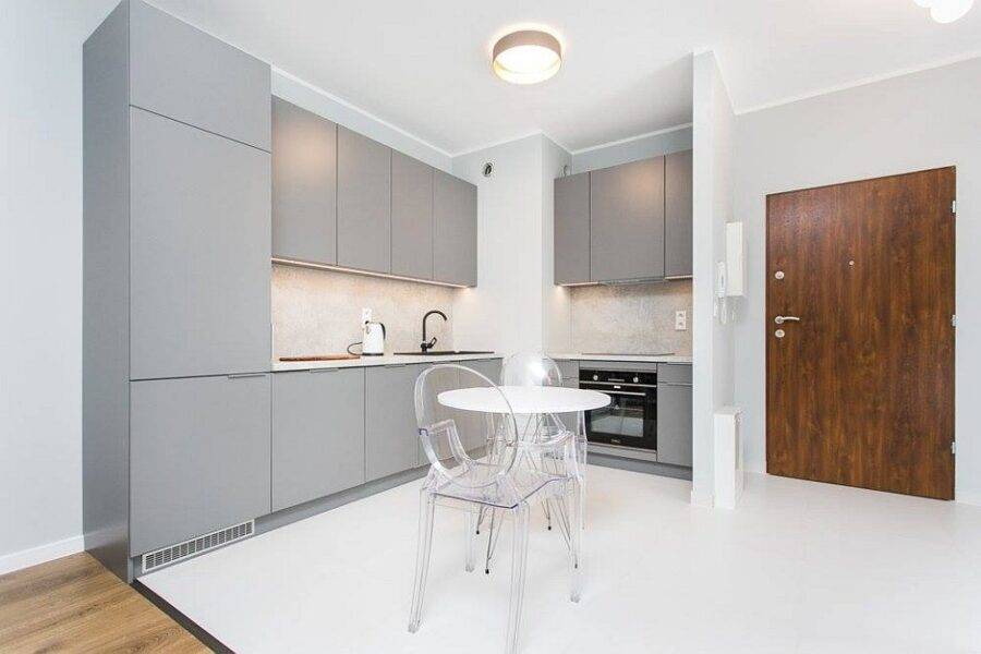 В узких кухнях прямоугольную мебель размещают рядом с окном или стеной, чтобы не загромождать комнату.