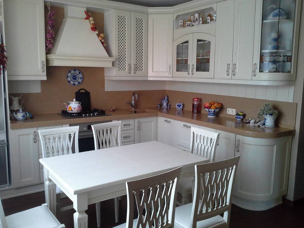 Для кухни в стиле прованс подойдет стеклянный стол на деревянных ножках и столешница с деревянным каркасом. Стекло – матовое или молочное, возможно – белое, бледно-сиреневое или бледно-сиреневое. Выбор цвета зависит от конкретного случая. А самый универсальный вариант – со стаканом молока. В этом случае уместна резьба на ногах, поскольку прованский стиль этнический, для него характерны такие «украшения.