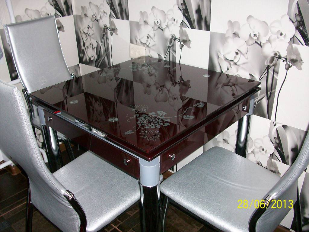 Несколько слов отдельно по поводу прочности и надежности. Если вы боитесь, что стеклянный обеденный стол может треснуть или разбиться, не беспокойтесь. Их изготавливают из специального ударопрочного стекла (каленого или ламинированного типа триплекс), которое разбивается только от ударов кувалды. Так что кастрюлей, тарелкой, чашкой вы его не разобьете. Вот разбить чашку или тарелку, слишком резко ее поставив, можно. Но стол при этом не пострадает.