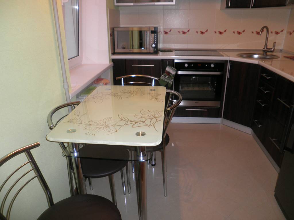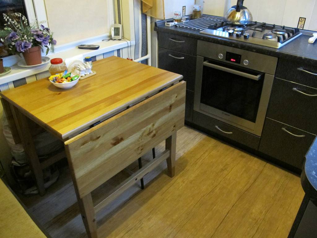 Размеры гармоничного стола в небольшой кухне – 80 на 60. Такие параметры позволяют размещать конструкцию любой формы. Красивые квадратные, овальные, прямоугольные стеклянные столы и кухонные группы от известного производителя IKEA пользуются большим спросом, благодаря красивому дизайну и доступной цене.
