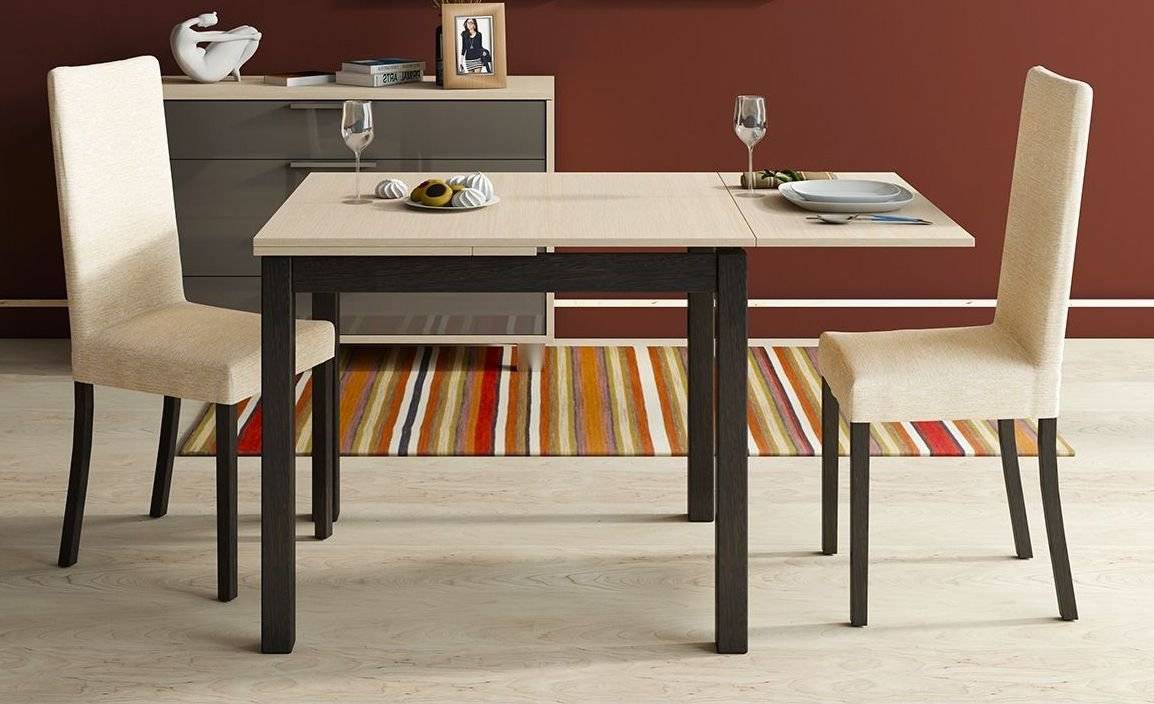 Раздвижной стол — такую модель можно назвать практичным приобретением для маленькой кухни или гостиной. Выглядит она, как обычный классический стол круглой, квадратной или прямоугольной формы, который, при необходимости, можно раздвинуть, увеличив размер столешницы.