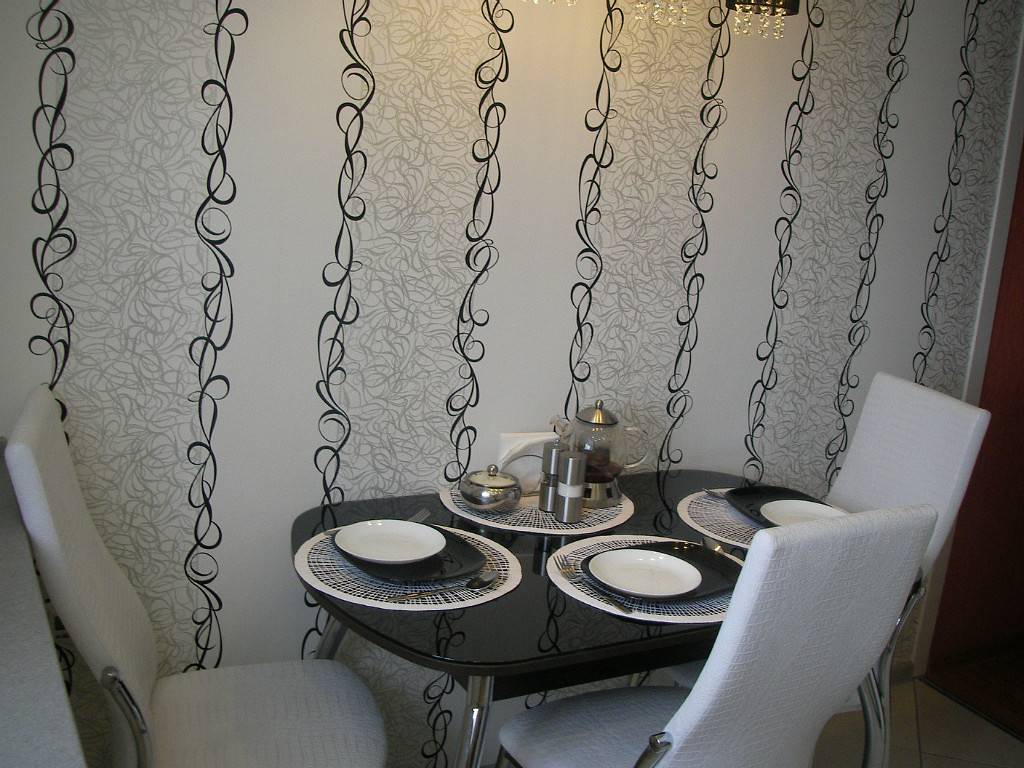 Конечно, стулья должны быть такими же, поэтому придется искать комплект – стеклянный стол с коваными ножками и стулья. Если столешница прямоугольная, вдоль длинной стены можно поставить скамейку.