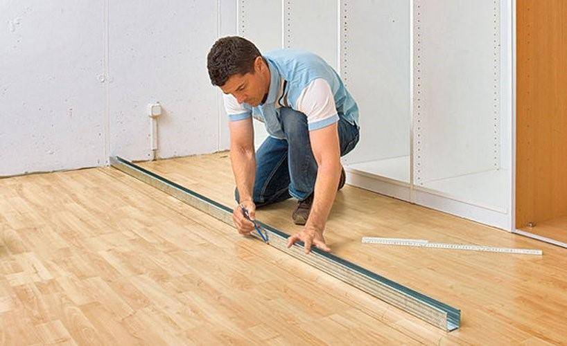 4. Направляющие профиля крепятся к полу. На каждый элемент должно приходиться не менее трех шурупов. При этом крепеж следует располагать с максимальным шагом 1 метр. Аналогичным способом монтируются направляющие профили на потолке;