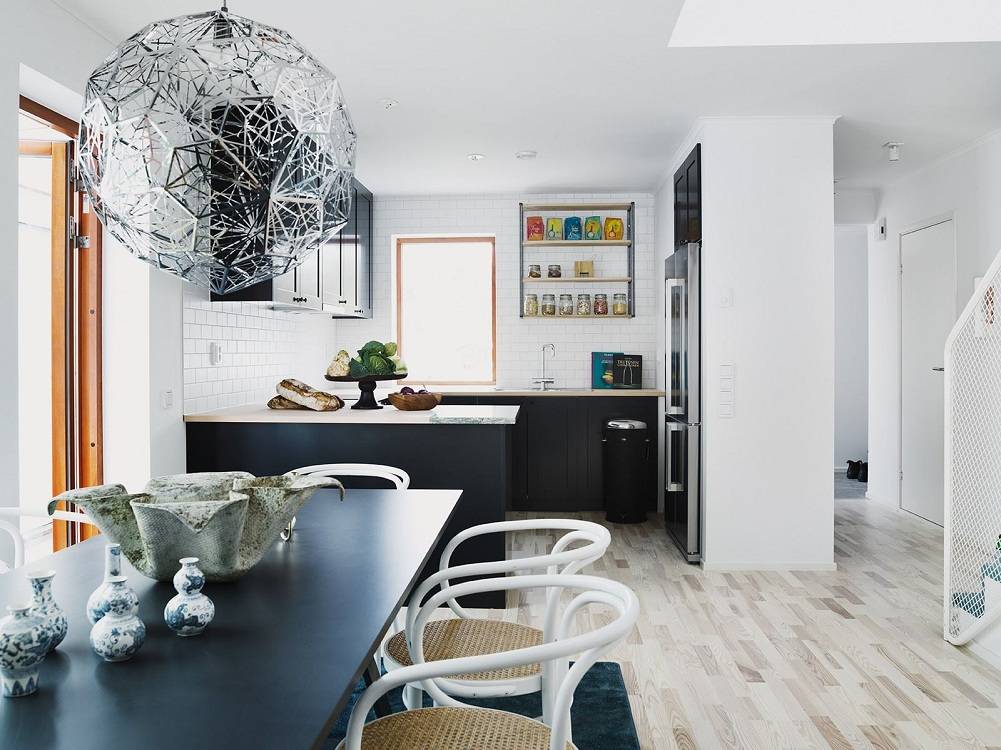Скандинавский стиль идеально подходит для создания уюта в скромных помещениях и совмещенных кухнях-гостиных. Однако не следует прибегать к этой концепции, оформляя просторную кухню с окнами на северную сторону. Такая кухня будет восприниматься как холодное неуютное место.