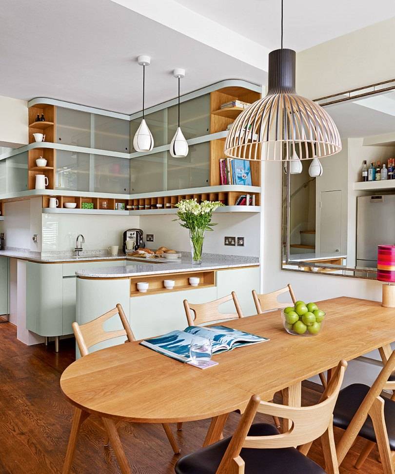 При обустройстве кухни, совмещенной со столовой, можно перенести в комод часть посуды или реже используемых аксессуаров и ограничить количество шкафов. Интересным решением являются кухонные планировки, полностью лишенные верхних шкафов – такой интерьер выглядит легким и современным.