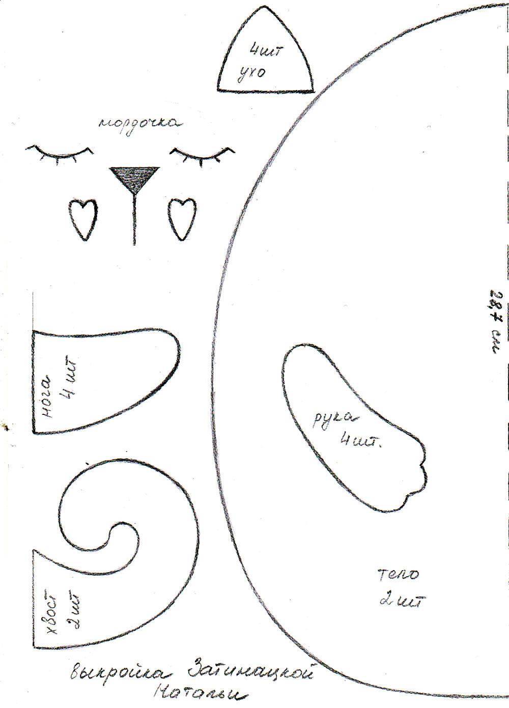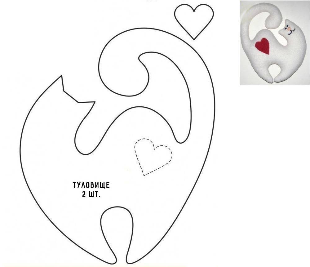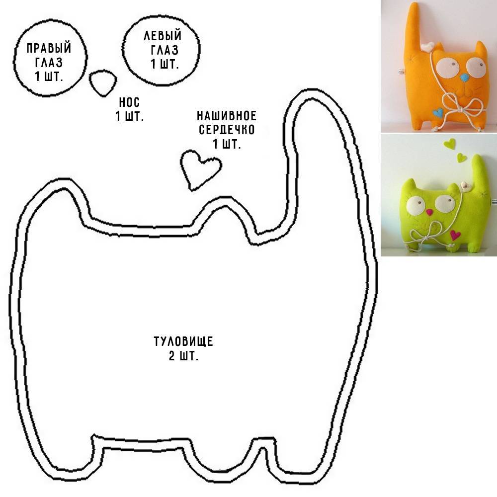 Три оригинальные выкройки забавных котиков для детской подушки своими руками. Каждая состоит из двух одинаковых, но зеркальных деталей. Глаза, нос, сердечко, рот можно выкроить и пришить вручную, на машинке швом зигзаг или вышить.