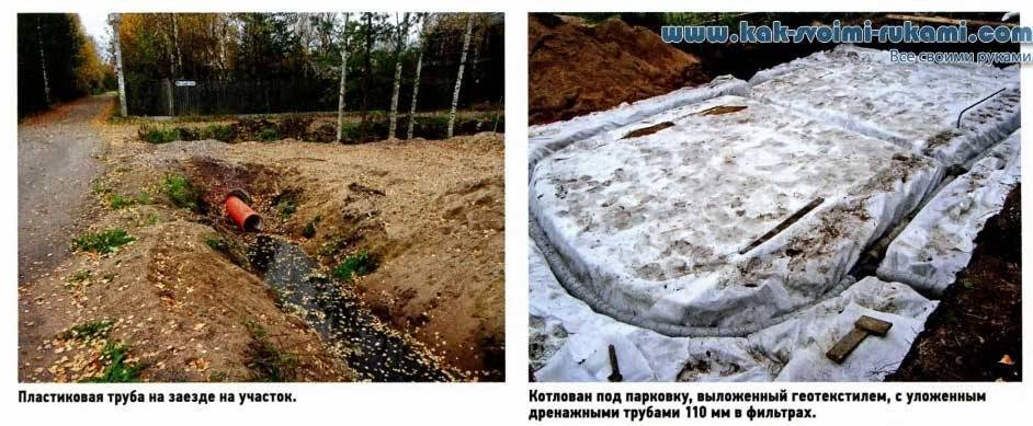 Пластиковую трубу также можно использовать для ремонта лопнувшей бетонной или асбоцементной трубы. В этом случае пластиковая труба меньшего диаметра заводится в просвет повреждённой трубы. На заезде на участок из бетона были отлиты бордюры, удерживающие песок и щебень от осыпания в дренажную канаву. Концы бордюров были скошены под углом примерно 15 градусов, чтобы исключить повреждения кузова автомобиля при выруливании на относительно узкой садоводческой дороге.
