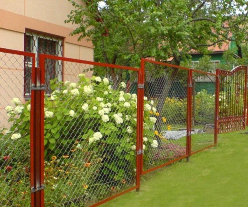 Ограда из рабицы может служить опорой для лиан, вьющихся роз, стать стержнем для живой изгороди. Кроме того, сетчатый забор органичен в любом проявлении — мелкоячеистый, крупноячеистый, с металлическими, каменными или кирпичными столбиками.
