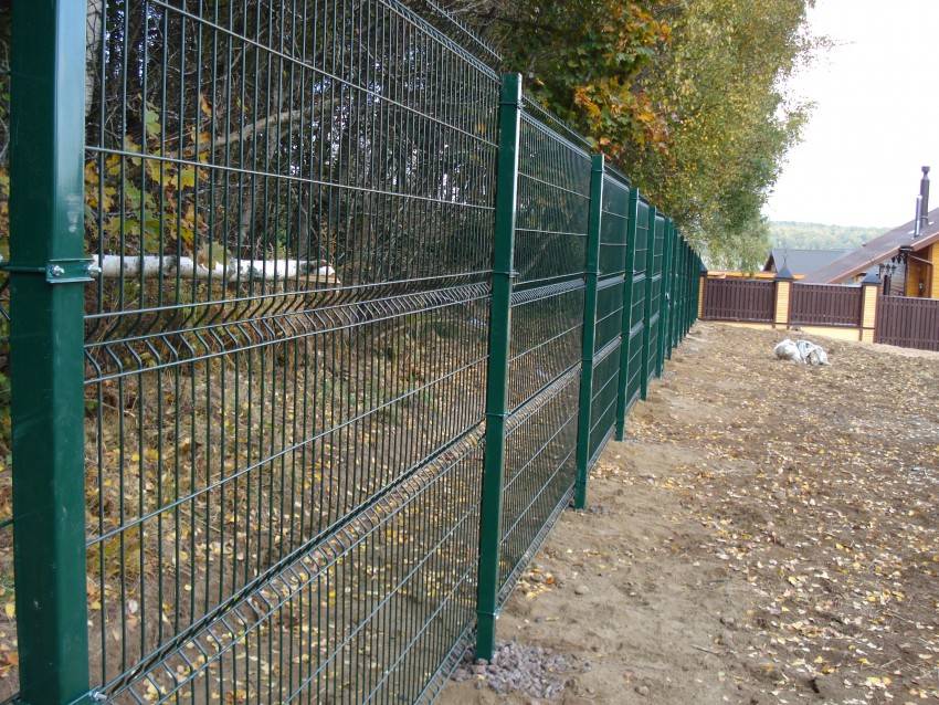 Не менее интересны в ограждениях современные материалы. Металл используется в разных вариантах, например, сварная сетка, защищенная горячим цинкованием или цинковым фосфатированием. Обычно прутья сварной сетки толщиной 4−5 мм устанавливают в бетонное основание. Гарантированный срок службы такой сетки — 10−12 лет, а изготовленные на заводе панели легко монтируются на месте. Обычно сетку окрашивают в зеленый цвет, но возможна и любая другая краска.