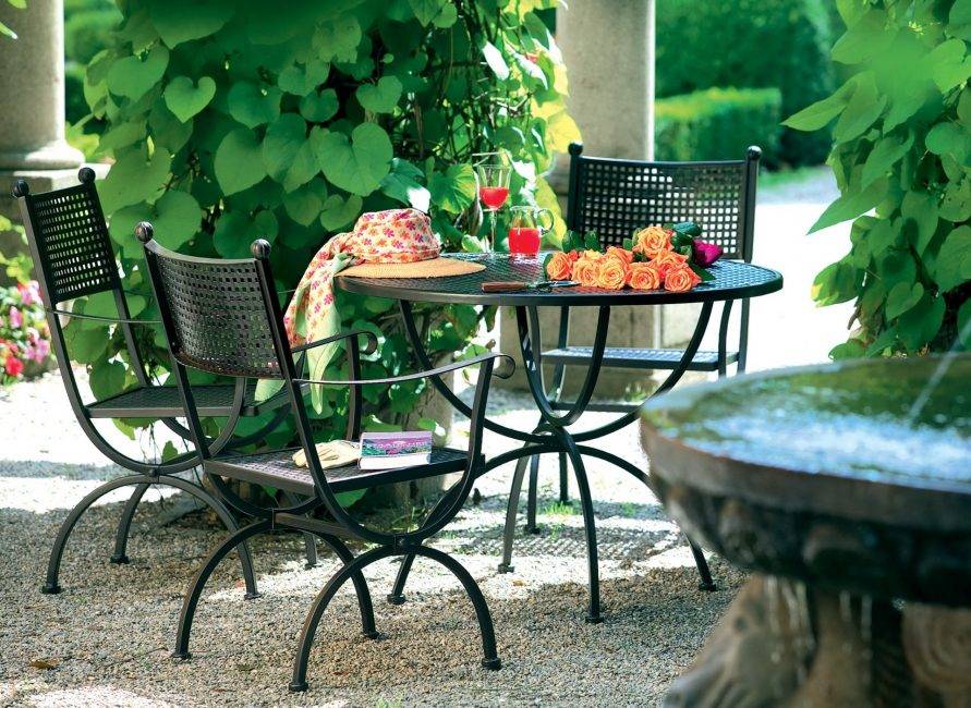 Стулья, лавочки, столы и другие предметы мебели для улицы часто делают из металла, используя в работе сварочный аппарат. Чтобы она смотрелась легкой и изящной, делают ажурные вставки. Под воздействием влаги материал постепенно разрушается. Избежать этого поможет антикоррозийное покрытие. Намного интереснее выглядят кованные детали. Их выполняют на заказ в специальных мастерских. Основание из ковки совмещают с деревянными, стеклянными или каменными элементами. Поэтому многие дачники приобретают основу и дополняют ее самостоятельно деталями из других материалов.