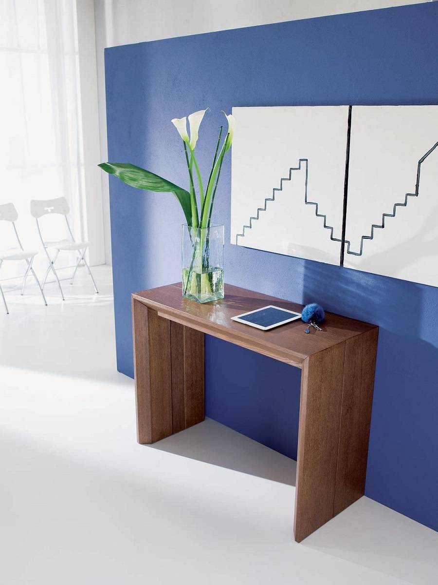 Столешница делится на два-три фрагмента. В зависимости от ширины может использоваться как небольшой стол в кухне, или в качестве консоли, как на фото выше.