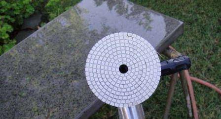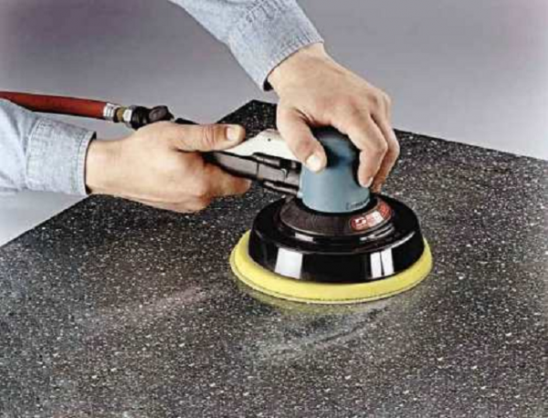 После снятия деревянного каркаса, столешницу из искусственного камня необходимо перевернуть. Затем с помощью шлифовальной машинки с крупной насадкой снимается почти 1 мм слоя. Теперь нужно пропылесосить и хорошо помыть столешницу, а потом обработать ее цементным раствором для скрытия пор.