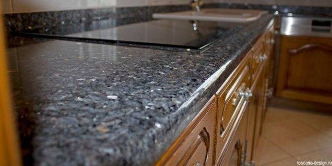 - Можно встретить столешницы огромным количеством включений: на их будут меньше заметны различные повреждения. Исходя из этого, этот вариант будет идеальным для обустройства кухни, где много и часто готовят.