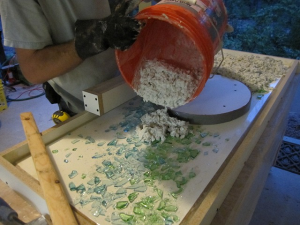 Первым делом на ровной поверхности верстака или рабочего стола выкладывается дно формы, его можно сделать из ПВХ панелей или фанеры с уложенным поверх стеклом. Чтобы добиться максимально плоской поверхности отливки из искусственного камня, стекло приходится разрезать на отдельные сектора и выкладывать на дно, стыки затираются мастикой или пластилином.
