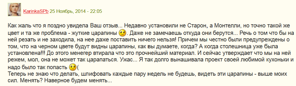 То есть, основное, на что жалуются владельцы таких столешен – это возникновение царапин.