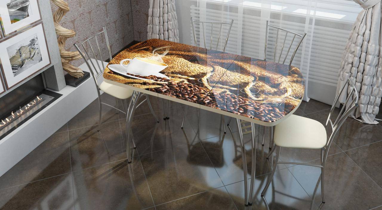 Отличная идея – поставить на кухне стол из стекла, украшенный фотопечатью. Такая поверхность практична в уходе. Орнамент нужно подбирать в соответствии со стилем, в котором выдержан интерьер.