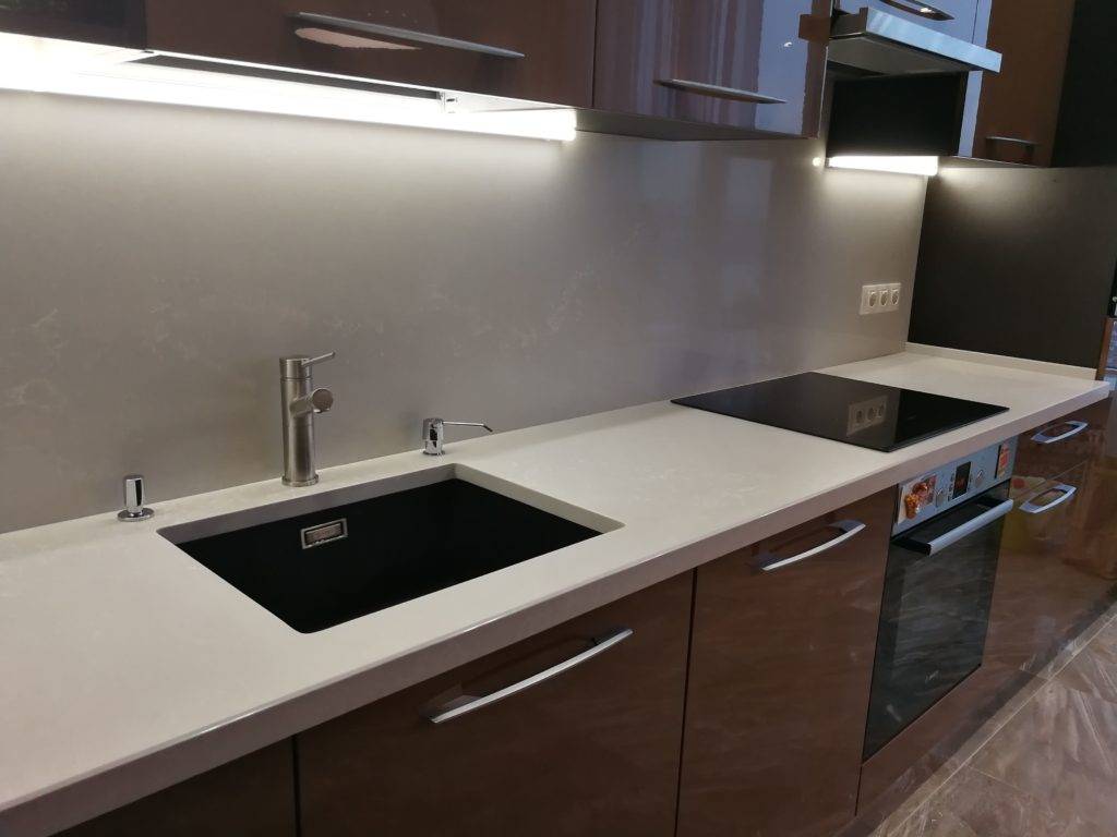 | Идеально подходит для сложных дизайнерских решений в современных кухнях. | Дороговизна (от 100 у.е. за кв.м.) как самой столешницы, так и всякого рода комплектующих, необходимых для ее полноценной установки. |