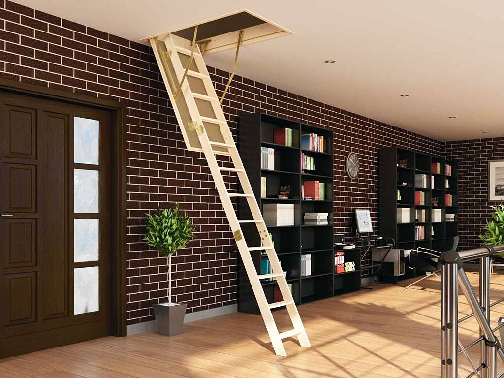 - Складная лестница на мансарду. Скажем сразу, данный вариант чердачной лестницы является наименее удобным. Среди основных причин такого положения дел можно выделить два момента: во-первых, лестницы данного типа меньше всего приспособлены для частого перемещения по ним человека. И, во-вторых, их необходимо постоянно складывать и раскладывать, дабы они не занимали пространства в комнате. В общем, с оглядкой на все это, складную мансардную лестницу можно назвать дачным вариантом либо изделием для очень не частого использования.