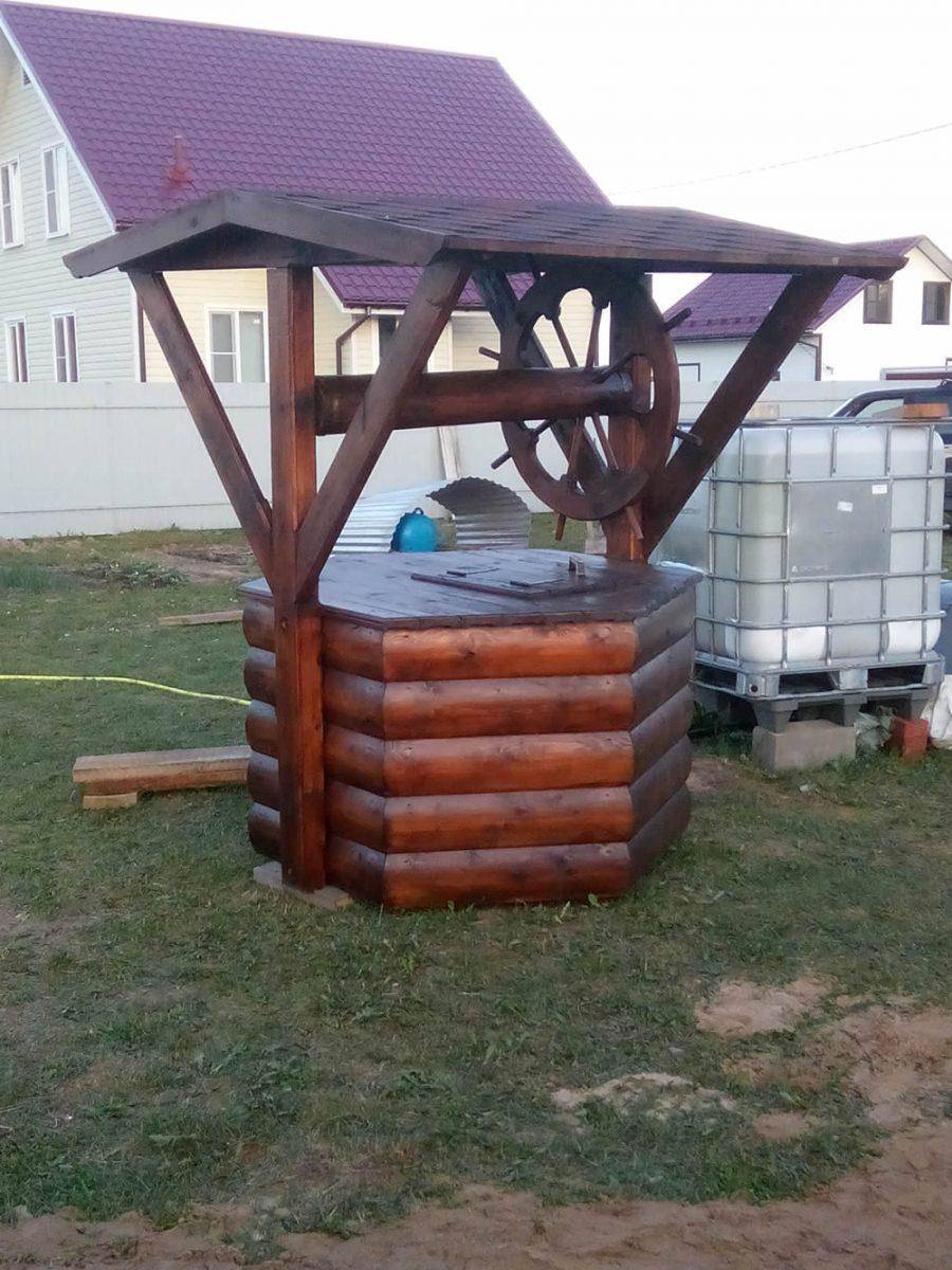 По размеру оголовка распиливают бревна одинаковой длины и выкладывают их срубом вокруг шахты. Выступающие края могут иметь фигурные вырезы в качестве декора сооружения. К массивной конструкции крепят вертикальные стойки, которые для прочности снабжают подпорками. На опоры крепят ворот с цепью и ведром, возводят каркас крыши. Благодаря основательности сооружения кровлю можно обшивать любым материалом – шифер, рубероид, черепица.