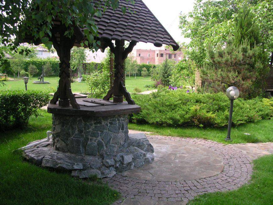 Чтобы подымать воду было легче, устанавливают стойки и ворот — в простейшем случае вращающееся бревно с ручкой, к которому прикреплена цепь. И все это вместе должно еще радовать глаз хозяев, но при этом требовать минимального ухода.