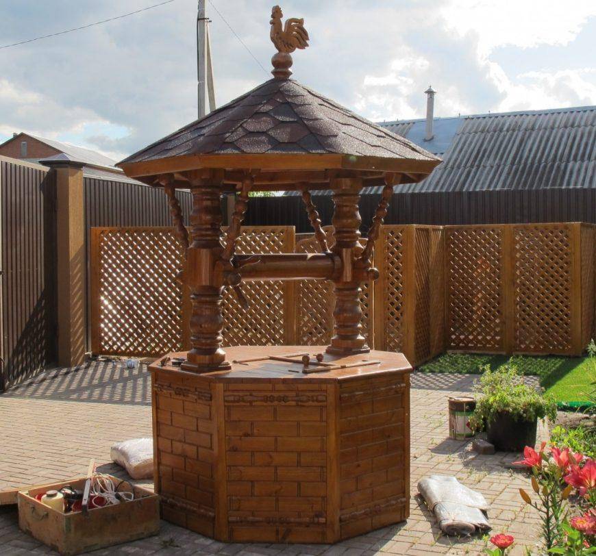Колодец достоин украшения в виде резных элементов на деревянных изделиях